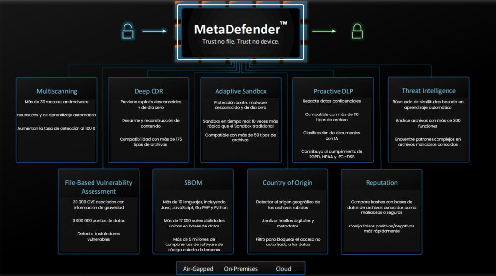 O MetaDefender incorpora uma gama de tecnologias líderes de mercado para proteger ambientes críticos de TI e TO, e reduz a superfície de ataque geral, detetando e prevenindo ameaças sofisticadas conhecidas e desconhecidas transmitidas por ficheiros, tais como malware evasivo avançado, ataques de dia zero, APTs (ameaças persistentes avançadas), etc.