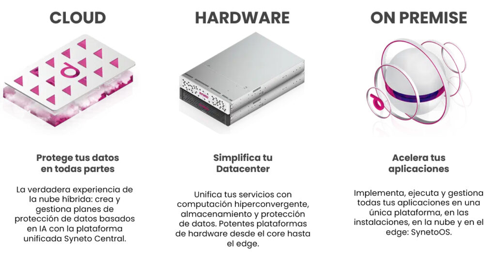 - SynetoOS VSA. A plataforma de gestão de dados SynetoOS é implementada como um dispositivo de armazenamento virtual dentro da infraestrutura existente.